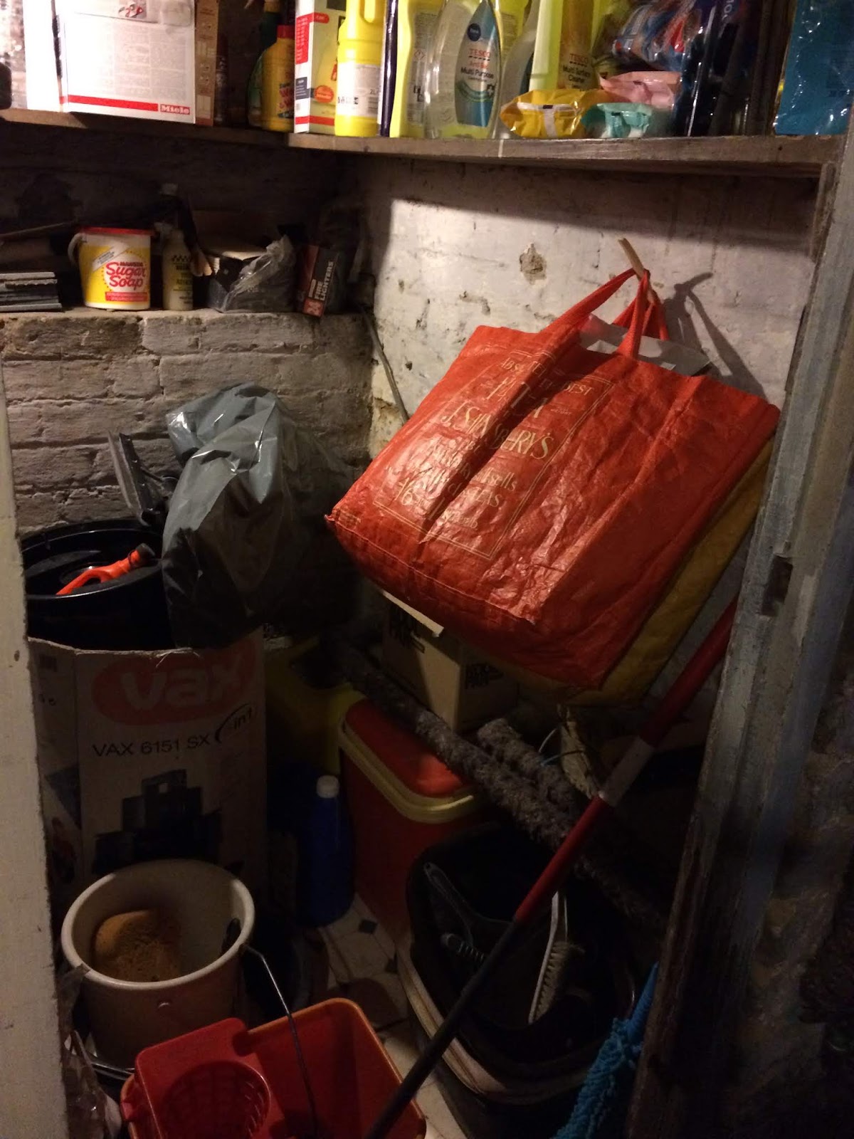 This is inside my cellar. Actually it's a terrible picture but the story behind it is that at the back of that alcove on the floor is a box containing my Vax machine. Until today that box had been in one of our bedrooms. Fortunately it was tucked behind a screen but still it wasn't an ideal place considering we have people viewing our house. First impressions count so I was determined to get that Vax box moved. Of course it required shifting stuff around in the cellar but I was pleased to have got it done!